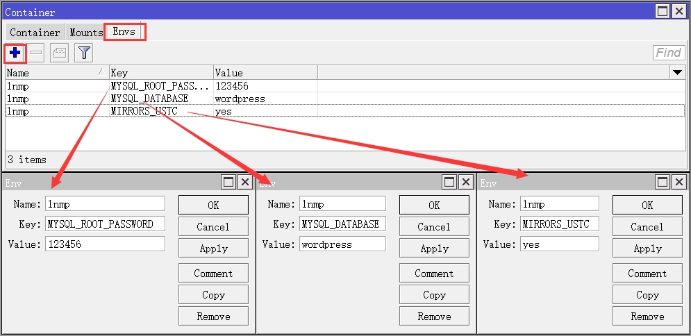 如果是在国内,现在使用这个URL一般会被墙,那就可以直接下载镜像包来安装,将下载的lnmp.tar镜像包上传到RouterOS根目录中。 - 创建相应的环境变量
