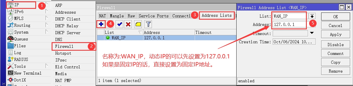 - 外网需要访问的话,需要创建端口映射,先创建外网的地址列表WAN_IP,用于端口映射