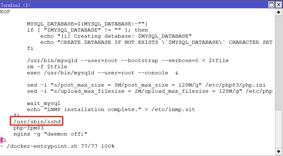 - 上面安装openssh后,容器重启后ssh不会自动运行,我们还需要将启动命令加入到启动命令中,使用vi编辑器打开vi /docker-entrypoint.sh 文件,滚动到文件最后面,在php-fpm83前面,加入/usr/sbin/sshd启动ssh。