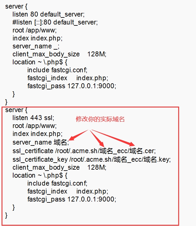 - 修改/etc/nginx/conf.d/www.conf中的内容,去掉ssl配置部分的#注释,然后将域名修改即可。