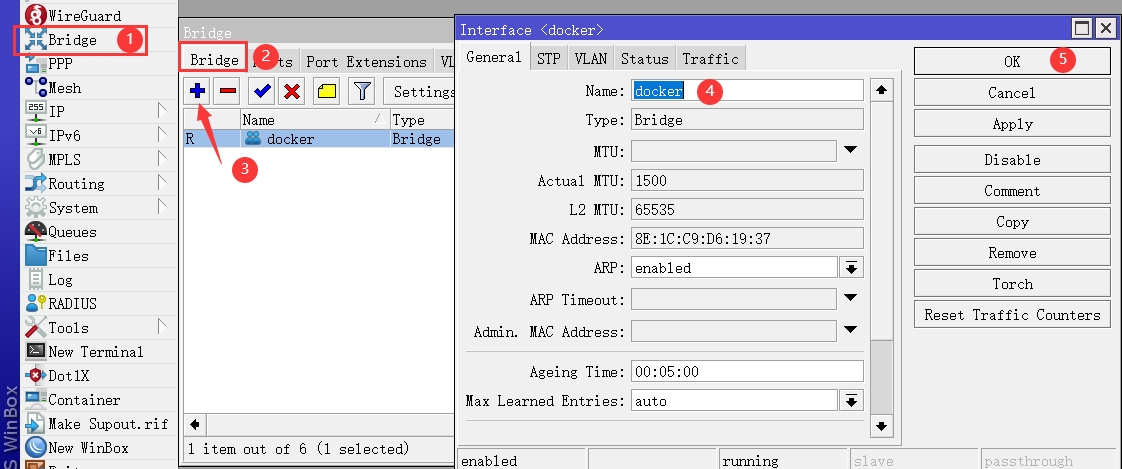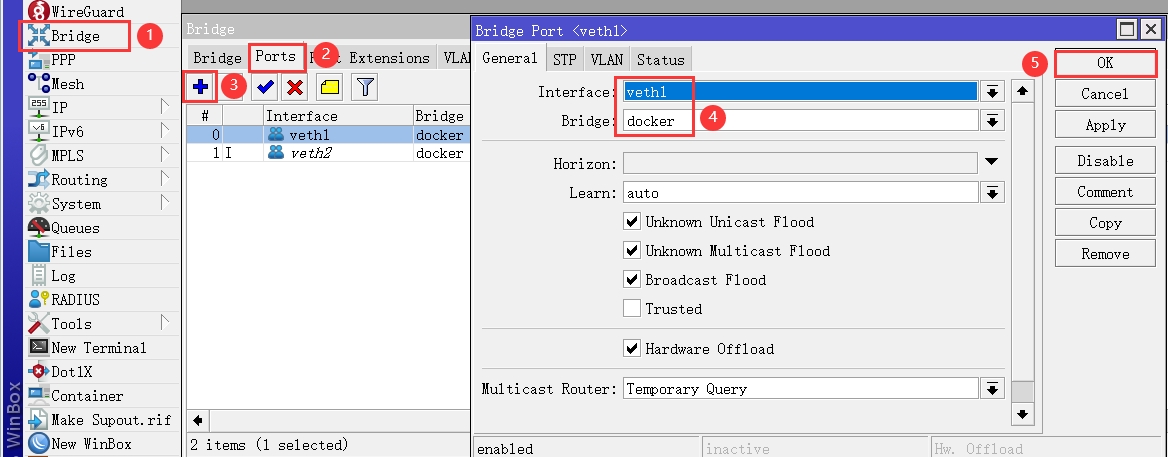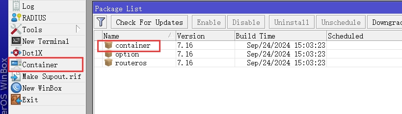 - 重启后,使用WINBOX登录ROS,左侧主菜单中出现Container,就说明Docker的扩展包已经安装成功。