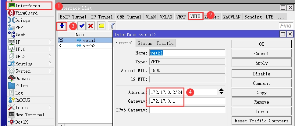 - 创建一个虚拟的接口veth1,IP地址为 172.17.0.2/24,网关172.17.0.1