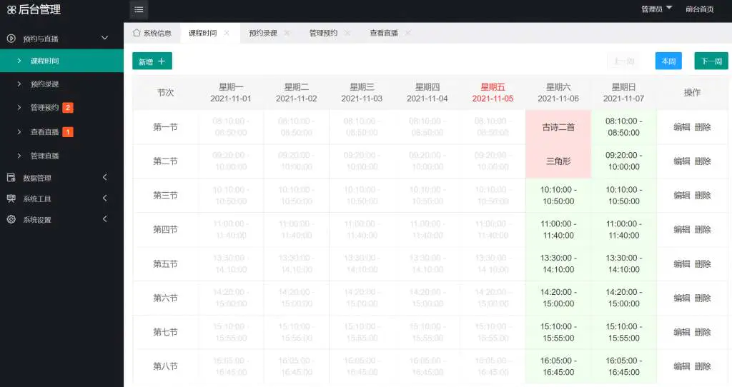 - 系统管理账号/密码为:admin/admin,网站编辑账号/密码为:editor/123456,教师账号/密码:teacher/123456 管理账号有所有权限,网站编辑有预约录像与视频管理等权限,教师账号仅有预约录像权限。